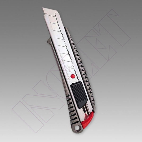 Cúter metàl·lic en alumini, mànec antilliscant amb bloqueig estàndard automàtic que manté la fulla fixa i segura. Tractat amb materials acrílics per a resistir l’aigua.