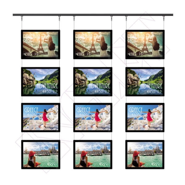 El Display It LED Flex puede ser montado en la pared o en el techo. El sistema se fija a esta guía y permite colgar las pantallas de LED a lo largo de toda su longitud. Los adaptadores especiales de los cables de acero que sujetan las pantallas LED pueden ser fácilmente enroscados dentro y fuera de la guía, permitiendo la máxima flexibilidad del sistema. Similar al Display It LED Fixed el mecanismo de auto-agarre permite que los cables de acero pasen a través de las pantallas de LED, conectándolas entre sí. Esto permite que su altura se pueda ajustar fácilmente.