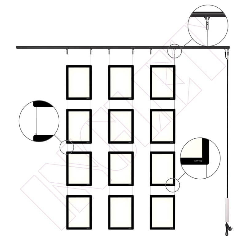 El Display It LED Flex puede ser montado en la pared o en el techo. El sistema se fija a esta guía y permite colgar las pantallas de LED a lo largo de toda su longitud. Los adaptadores especiales de los cables de acero que sujetan las pantallas LED pueden ser fácilmente enroscados dentro y fuera de la guía, permitiendo la máxima flexibilidad del sistema. Similar al Display It LED Fixed el mecanismo de auto-agarre permite que los cables de acero pasen a través de las pantallas de LED, conectándolas entre sí. Esto permite que su altura se pueda ajustar fácilmente.