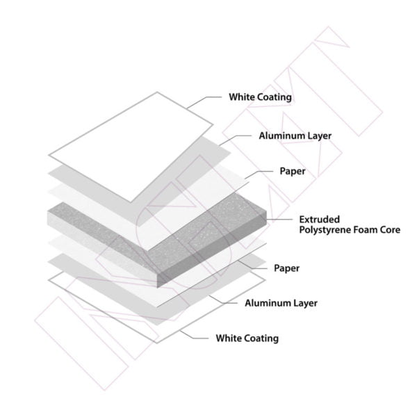 Revestimiento blanco / Capa de aluminio / Papel / Núcleo de espuma de poliestireno extruido / Papel / Capa de aluminio / Revestimiento blanco.