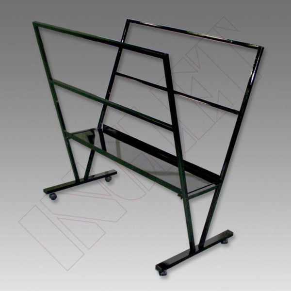 Resistente expositor de láminas fabricado con tubo metálico de sección cuadrada de 20 mm. Incorpora ruedas para su fácil manejo. Fácilmente plegable.