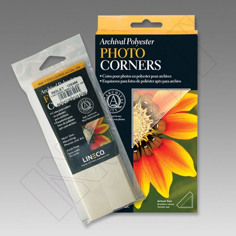 Os protectores de canto adesivos de arquivo de poliéster (Melinex ou equivalente) sensíveis à pressão praticamente desaparecem na página que contém fotografias e documentos firmemente no seu lugar. São isentos de ácidos e não contêm nenhum dos plastificantes nocivos que afectam a maioria dos protectores de canto de plástico. Para montagem de artigos de peso leve a médio. Seguro e fácil de usar. Não danificará as fotos.