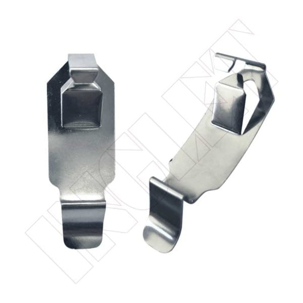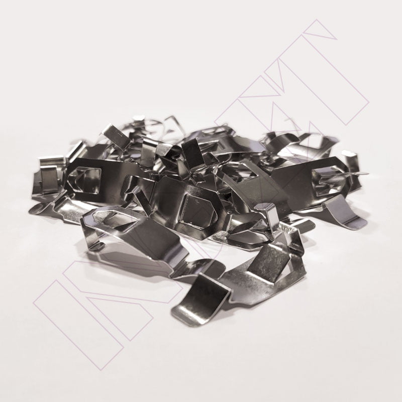 Pinças para segurar vidros, metacrilatos e tábuas. Com este sistema original, suporte, película e vidro são mantidos juntos numa sanduíche, para obter uma moldura quase invisível. Fabricado em aço niquelado. Os grampos são fixados à prancha por um ponto que é pregado na parte de trás e uma pequena aba que é fixada ao vidro.